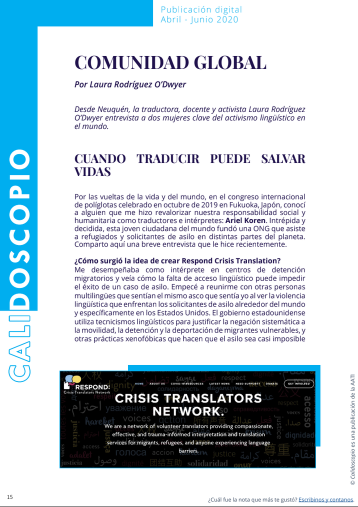 We want to thank all of AATI’s board members for enabling this partnership and, particularly, extend our gratitude to AATI’s President, Marita Propato, and to Alejandra Rogante, member of the board and director of the organization’s Calidoscopio, AATI’s bimonthly publication. In the April-June edition of Calidoscopio you will find two interviews in Spanish about the origins of Respond and the personal experience from one of our volunteers. See page 15, AATI Calidoscopio.