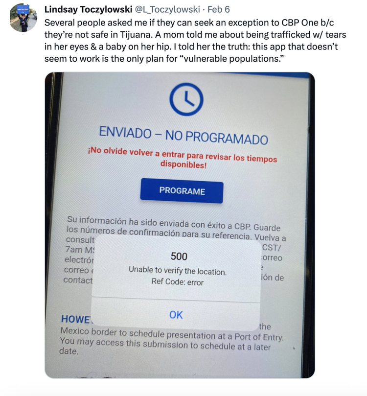 Last month, our partners at Immigrant Defenders Law Center reported that out of 150 families attempting to use the app at the border, not a single family was able to schedule with the app. The CBP app’s ensuing error message is only provided in English, causing confusion and panic as shown in the tweet below.