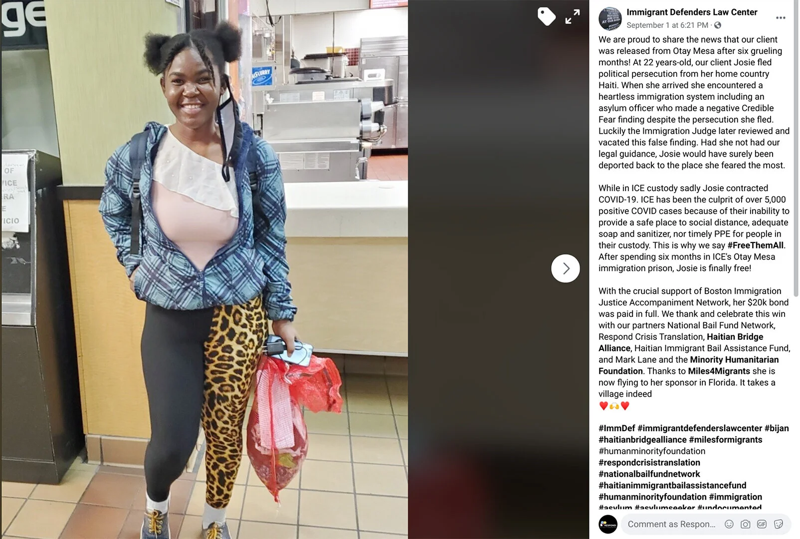 Our partner Immigrant Defenders shared good news this week! We are so proud of all of the translators on our Haitian Creole team, led by Krystel Alexandre, for their tireless work to support asylum seekers. We are so happy that our client Josie is finally safe and free.