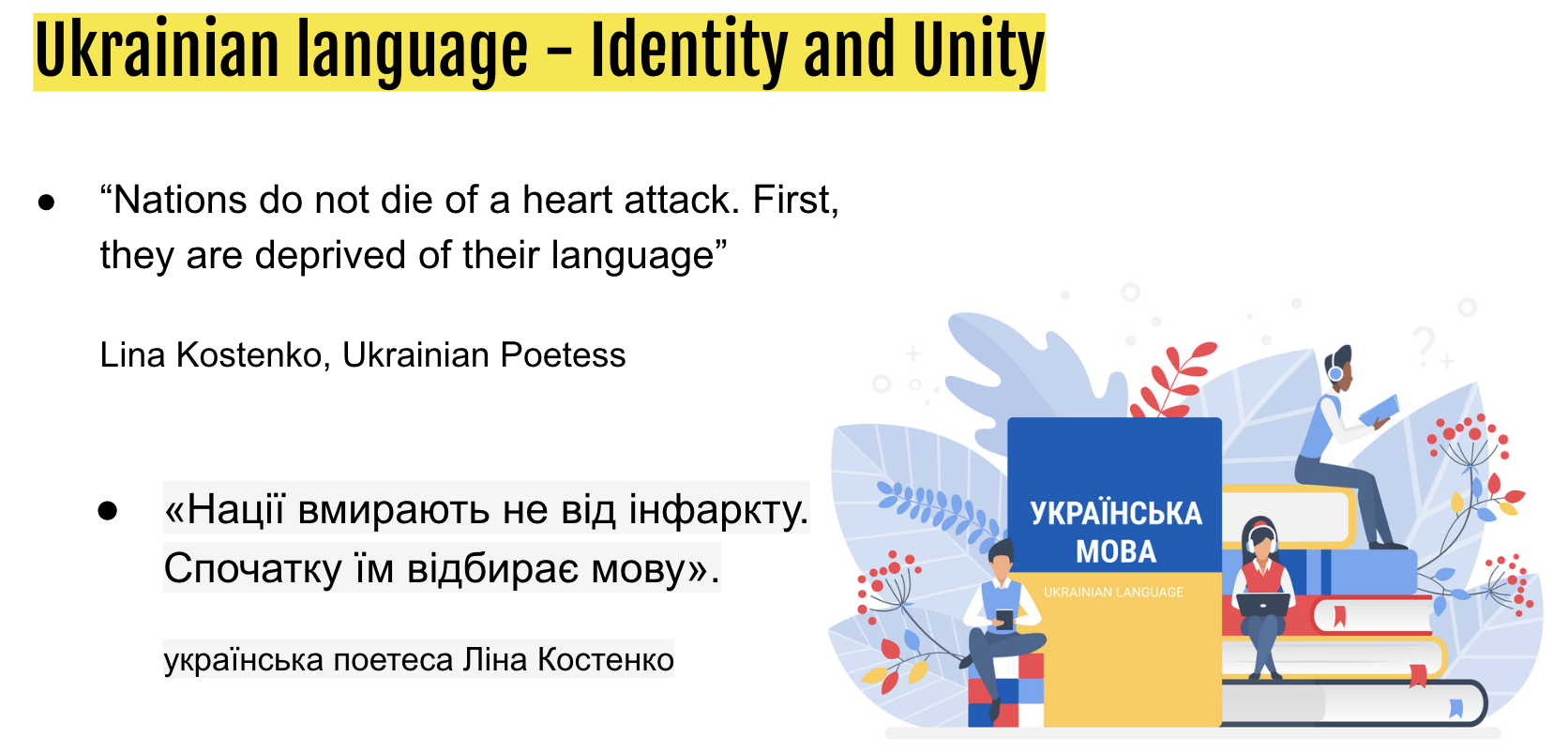 Мова – найбільше багатство кожної людини і етносу, адже без мови немає народу, тож недаремно мову називають ДНК нації. Зловіщо правдивими є слова відомої української поетеси Ліна Костенко: «Нації вмирають не від інфаркту. Спочатку їм відбирає мову».
