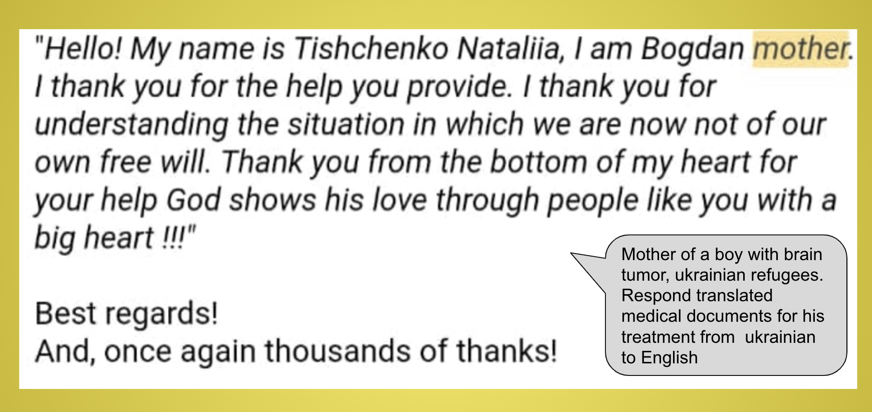 Тисячі організацій з усього світу підтримали Україну та українців і миттєво відреагували, щоб надати гуманітарну допомогу, медичну допомогу, житло тощо – усе найнеобхідніше в УкраЇні та усіх тих країнах, які прихистили 15 мільйонів українців. Мільйони українців подали документи на притулок в інших країнах без знання мови. Із поданням документів їм допомагала велика кількість адвокатських організацій. Все це було б неможливо без мови та без перекладу. І ми бачимо, що мова та переклади між мовами – це найперший інструмент, шоб всі ці речі сталися.