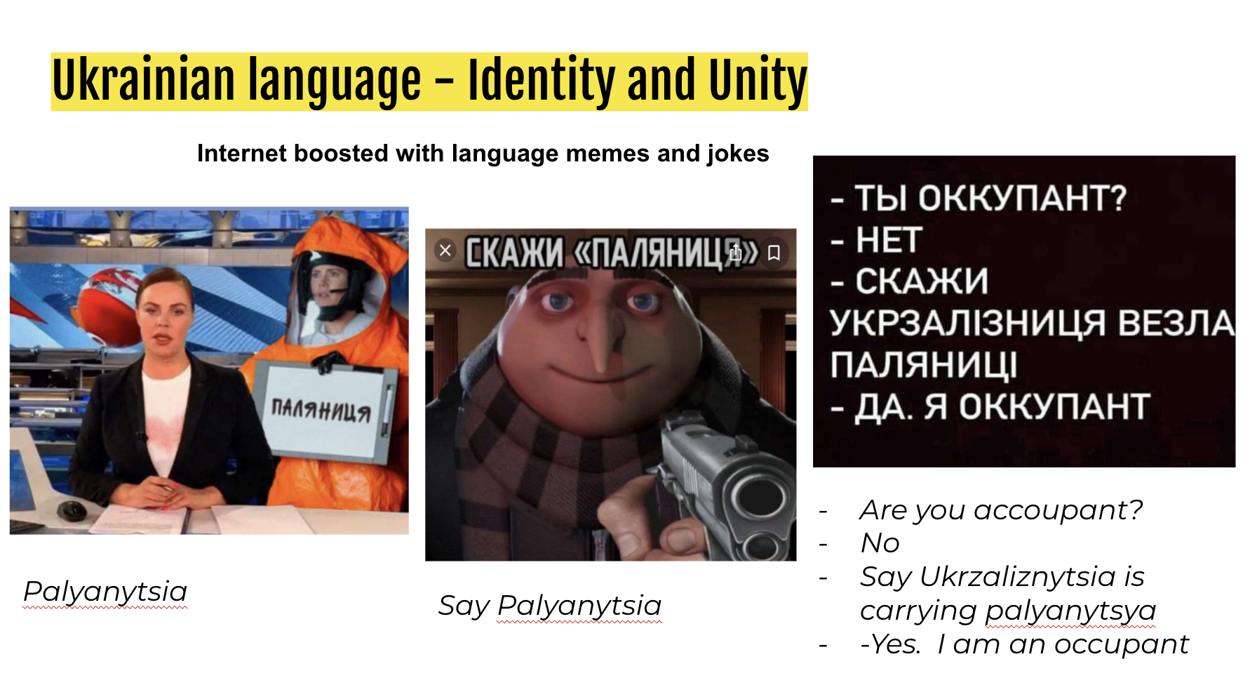 After the beginning of the full scale invasion of Ukraine on 24 February 2022, the Ukrainian language boosted in its evolution of mass usage. First of all, it became an identifying marker on the battlefield of “us” or “them.” Ukrainian Words Palyanytsia, Ukrzaliznytsia, Nisenitnytsisa and Khustynka, etc. started being used as a challenge and response (password), as native Russian speakers could not pronounce them due to phonetic peculiarities. The Internet exploded with language memes and jokes.